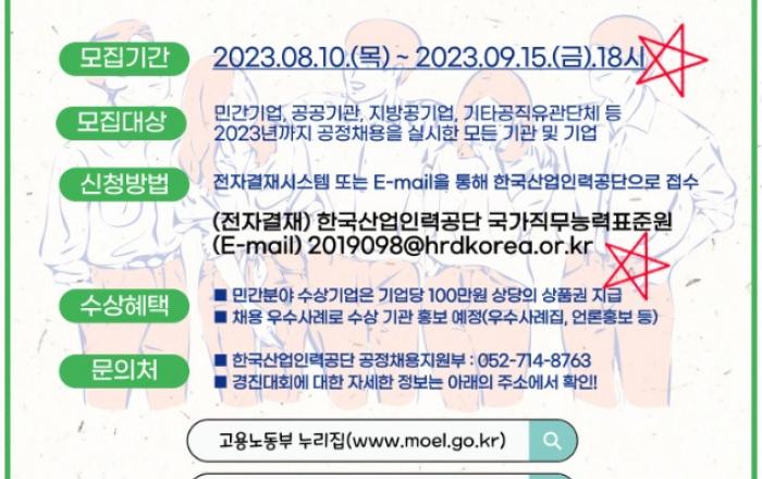 고용노동부와 한국산업인력공단(이사장 직무대행 김영중)은 8.10.(목)부터 9.15.(금)까지 '2023년 공정채용 우수사례 경진대회' 참여기업을 모집한다고 밝혔다. 이번 경진대회는 “공정한 채용기회 보장(국정과제)”과 관련한 현장 우수 실천사례를 발굴?포상함으로