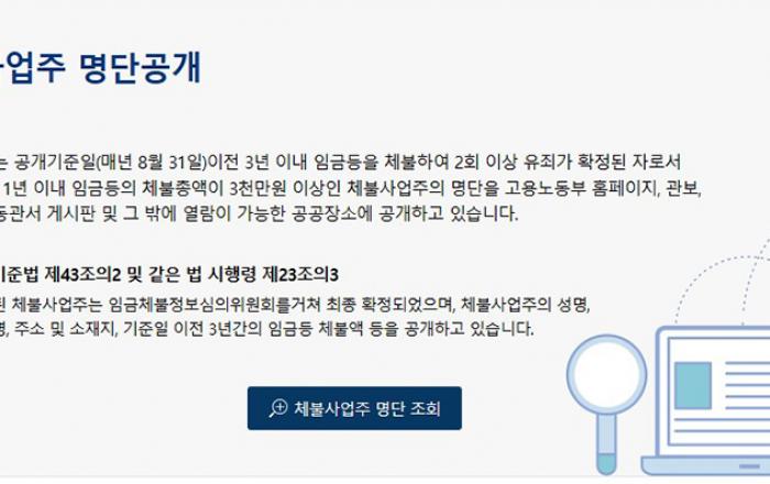 고용노동부가 13일 고액의 임금을 상습적으로 체불한 사업주 172명의 명단을 누리집에 공개했다. 이번에 명단이 공개되거나 신용제재를 받게 된 사업주는 공개 기준일 이전 3년 이내에 체불로 2회 이상 유죄가 확정되고, 1년 이내 체불총액이 3000만원(신용제재는 20