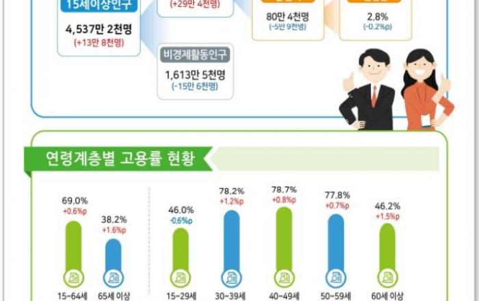 4월 고용률(62.7%), 경활률(64.4%) 및 실업률(2.8%)은 각각 4월 기준 역대 최고.최저 수준을 달성하며 지난 1분기의 양호한 고용흐름이 지속되었다. 취업자수는 작년 기저(’22.4월 86.5만명, 연간 81.6만명)에도 불구하고 26개월 연속 증가(35.