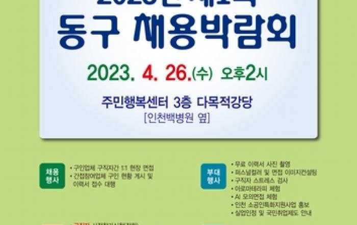 인천 동구가 오는 26일 오후 2시 주민행복센터에서 2023년 제1회 채용 박람회를 개최한다. '활기찬 동구, 행복한 내일(JOB) 찾기'라는 주제로 개최되는 행사는 중부지방고용노동청·동구건강가정복지센터·인천재능대학교 취창업지원센터 등 지역 내 유관기관과 협력해 다