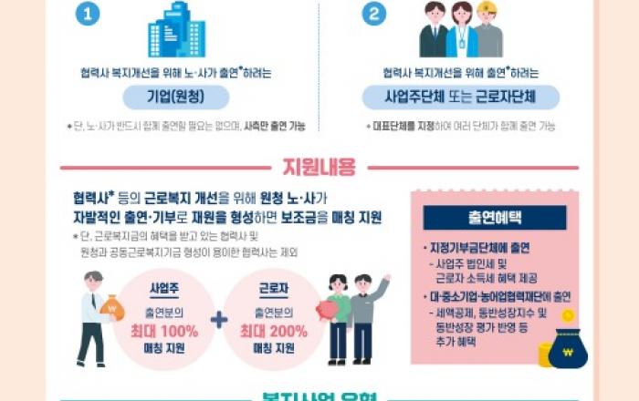 원하청 간 격차 축소 및 노동시장 이중구조 개선을 위한 대기업의 상생 활동을 지원하는 사업이 신설된다. 고용노동부와 근로복지공단은 3월 20일(수), 대기업(원청) 노·사가 협력사 근로복지 증진을 위해 재원을 마련하면, 정부가 지원하는 ‘상생연대 형성지원’ 사업을 공