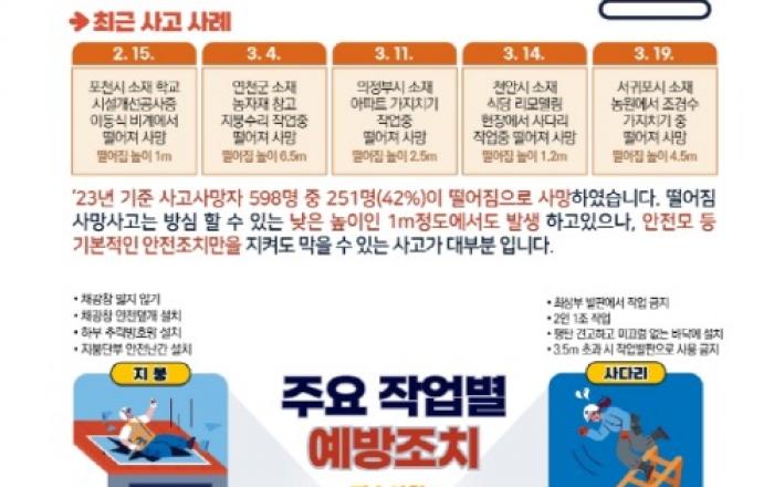 최근 봄철 맞이 시설개선, 조경공사 등 소규모 공사 과정에서 지붕, 사다리, 나무, 이동식 비계 위에서 작업하다 떨어져 사망하는 안타까운 사례가 연이어 발생하고 있다. 고용노동부(장관 이정식)와 한국산업안전보건공단(이사장 안종주)은 2024년 제6차 현장점검의 날인 3