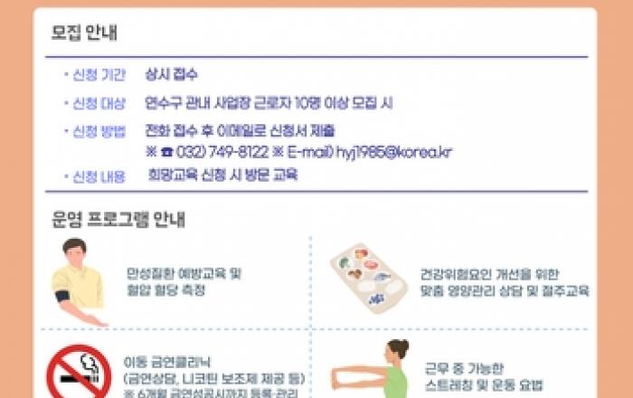 연수구는 올해 50인 이상 사업장 대상으로 찾아가는 통합 건강프로그램인 '건강한 회사 만들기' 사업을 확대 추진한다. '건강한 회사 만들기' 사업은 건강검진결과 유소견자 등 과도한 업무에 따른 피로감, 잦은 음주, 신체활동 부족과 잘못된 식습관 등으로 만성질환에 노