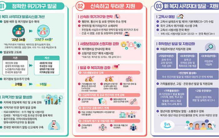 정부가 복지 사각지대에 놓인 위기가구를 보다 정확히 찾기 위해 기존 ‘개인단위 모형’에서 ‘세대단위 모형’으로 개선하는 등 발굴 모형을 다양화한다. 또 위기가구 발굴 시 질병과 채무 정보 등을 추가로 연계해 사각지대 발굴 대상자 선정의 정확도를 제고하고, 주요 위