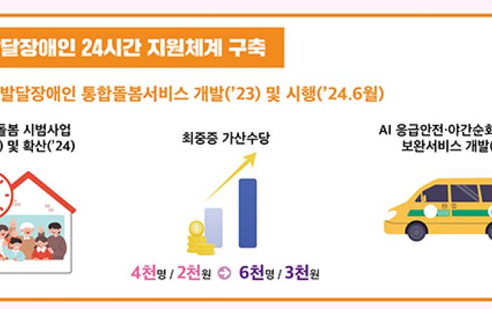 정부가 발달장애인 가족의 돌봄 부담을 덜기 위해 오는 2024년 6월부터 최중증 발달장애인들에 대해 24시간 통합돌봄 서비스를 제공한다. 이에 앞서 내년 4월부터는 발달장애인 보호자의 입원 및 경조사 등 긴급상황이 발생하는 경우 일시적으로 24시간 돌봄을 지원하는