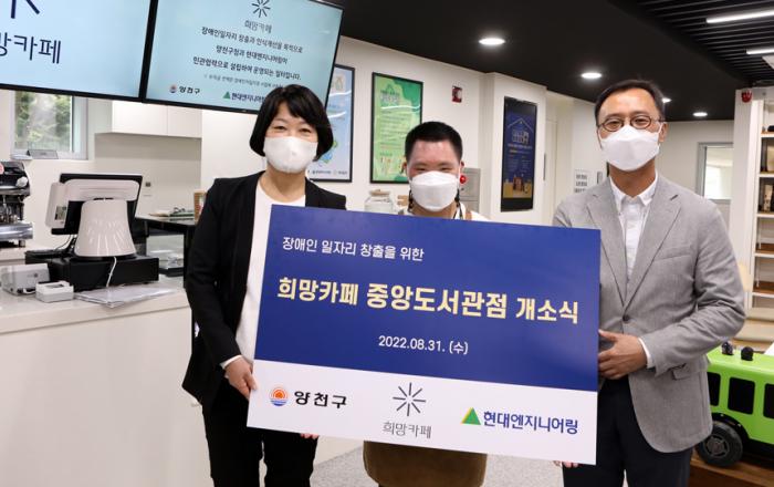 현대엔지니어링이 지난 31일(수) 양천구와 함께 장애인 일자리 창출의 일환으로 ‘희망카페 5호점’을 개소했다고 1일 밝혔다.이날 양천구 신정동 양천중앙도서관에서 진행된 ‘희망카페 5호점’ 개소식에는 현대엔지니어링 엄홍석 커뮤니케이션실장, 강옥현 부구청장 등 관계자들이