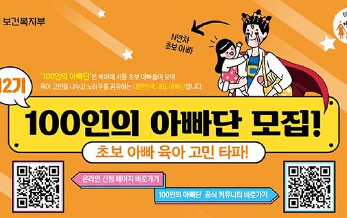보건복지부는 올해도 전국 17개 시·도에서 ‘100인의 아빠단’에 참여할 12기 아빠를 19일부터 6월 2일까지 각 100명씩 모집한다고 밝혔다.참가대상은 3~7세(2016~2020년생) 자녀를 둔 아빠들이다. 다양한 분야의 육아 방법을 배우고 선배 아빠들의 실질적인