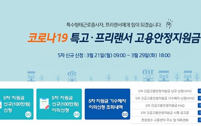고용노동부는 21일부터 오는 29일 오후 6시까지 ‘5차 긴급고용안정지원금’ 신규 신청을 받는다고 밝혔다.이번 신청은 1~4차 긴급고용안정지원금을 지원받지 않은 특수형태근로종사자(이하 ‘특고’)와 프리랜서 가운데 지난해 10~11월 중 이번 5차 긴급고용안정지원금에서