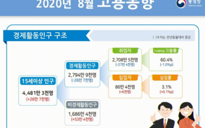 8월 취업자수가 지난해 동기대비 27만명 넘게 감소했다. 코로나19에 장마와 폭우 피해까지 더해지면서다. 다만 취업자수 감소폭은 4월을 정점으로 한뒤 4개월째 줄어드는 모습이다. 통계청이 9일 발표한 ‘2020년 8월 고용동향’에 따르면 지난달 취업자수는 2708만50
