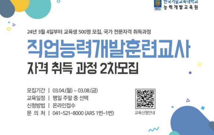 한국기술교육대학교 부설 능력개발교육원은 2024년 제2차 직업능력개발훈련교사(이하 ‘직업훈련교사’) 자격과정(양성과정) 교육생 500명을 3월 4일(월)부터 3월 8일(금)까지 모집한다. 능력개발교육원은 올해 총 4차에 걸쳐 총 2,400여명의 직업훈련교사를 모집,