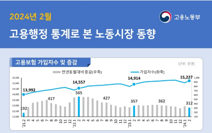 (가입자수) 2024년 2월말 기준 고용보험 상시가입자는 1,522만 7천명으로 전년동월대비 31만 2천명(+2.1%) 증가 제조업(+74천명)과 서비스업(+235천명)은 증가, 건설업(-4천명)은 감소 - 제조업은 금속가공, 식료품, 기타운송장비, 자동차 등을