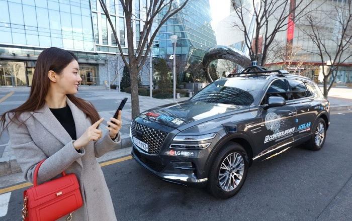 # 승용차를 타고 빌딩 앞에 내린 A씨. 차를 정문 앞에 그대로 두고 건물로 들어선다. A씨는 엘리베이터를 기다리며 모바일 앱(App.)으로 근처 주차장을 찾는다. 앱 화면에서 빈 주차공간을 터치하자 승용차가 스스로 해당 장소로 이동한다. 횡단보도와 교차로 신호를 지키