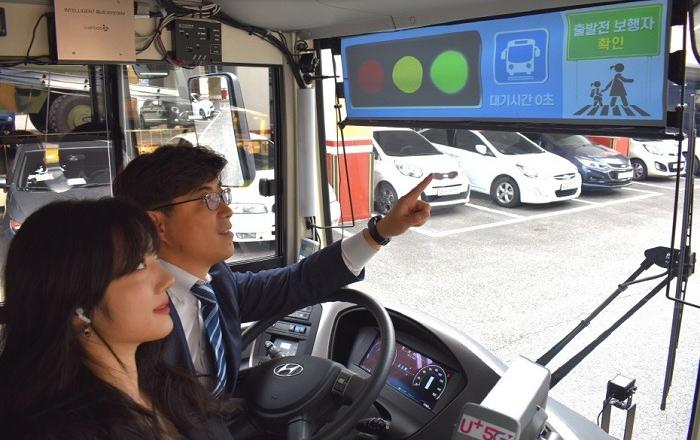 # 스마트 수소버스가 출발을 시작하자, 운전자 앞 창문 상단에 버스운행위치, 운행간격이 표시된다. 운행 중에는 버스 앞 교통신호가 교체될 때까지 잔여시간을 보여준다. 탑승객은 다음역 환승 정보를 직접 검색하지 않아도 버스 옆 창문에 투영된 화면에서 필요한 정보를 즉시