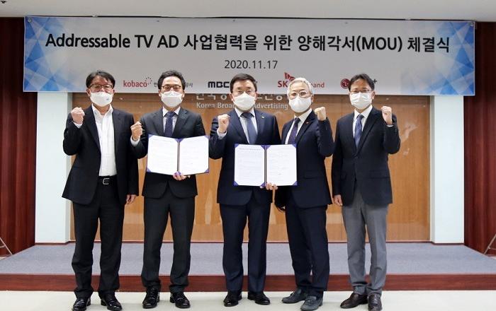 LG유플러스와 MBC, KOBACO, KT, SK브로드밴드 등 5개 사는 17일 오후 KOBACO에서 "Addressable TV AD 사업협력을 위한 양해각서(MOU)"를 체결했다고 밝혔다. 각 사는 이 MOU를 통해 국내 방송광고 경쟁력강화를 위해 어드레서블 TV