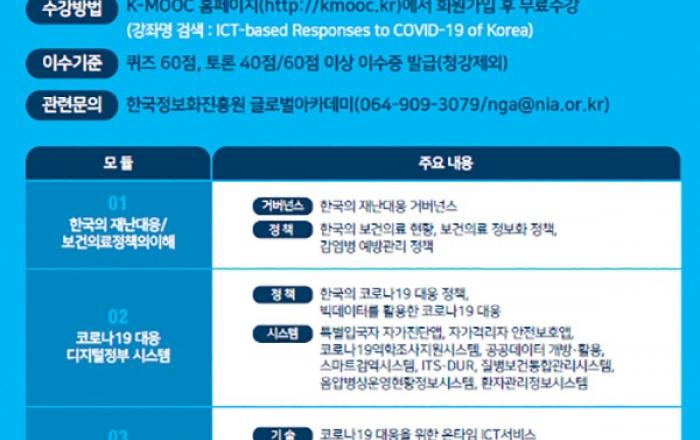 행정안전부가 디지털정부와 정보통신기술을 활용해 코로나19에 신속하게 대응할 수 있었던 K-방역 사례를 국제사회와 공유하는 자리를 마련한다.이에 따라 한국정보화진흥원 및 국가평생교육진흥원과 함께 12일부터 30일까지 3주동안 ‘케이무크(K-MOOC, http://kmoo