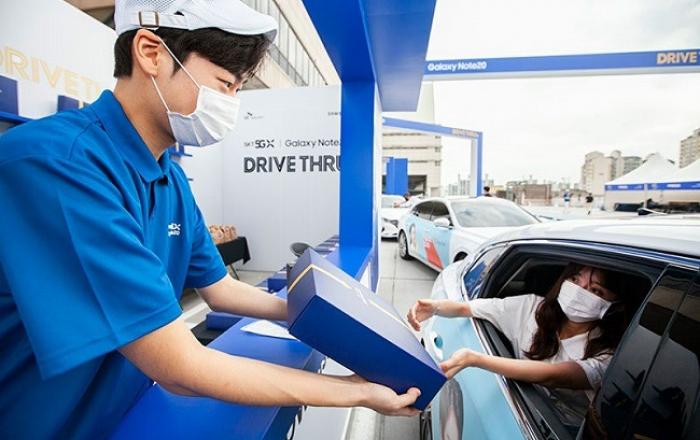 SK텔레콤이 휴대폰 개통 서비스에도 ‘드라이브 스루’를 도입해 화제다.SK텔레콤이 코로나19로 각종 오프라인 행사가 어려움에도 불구하고 노트20 개통일(14일) 전날인 13일 오전 서울 도심 한복판에서 ‘갤럭시 노트20 5G 드라이브 스루(Drive-Thru) 행사’를