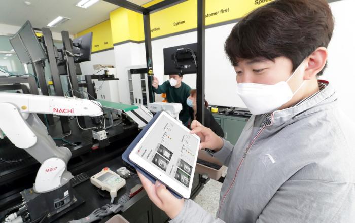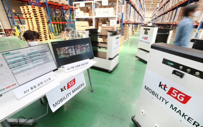 KT가 물류센터에 자율주행 운반 카트와 관리 시스템 등을 적용해 물류 영역의 언택트 기술 발전을 주도한다. KT는 각 대리점 등에 단말기를 공급하는 물류센터 효율화를 위해 통신업계 최초로 물류센터 운영에 5G 자율주행 운반 카트를 적용했다고 24일 밝혔다. KT는
