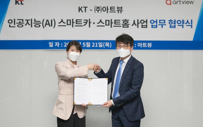 KT가 스마트 디바이스 전문회사 아트뷰와 21일 오전 경기도 안양시 동안구 아트뷰 본사에서 ‘스마트카∙스마트홈 AI 사업 협력을 위한 업무협약(MOU)’을 체결했다고 밝혔다. 협약식에는 KT AI/BigData사업본부장 김채희 상무, 아트뷰 구원겸 대표 등 양사 주요