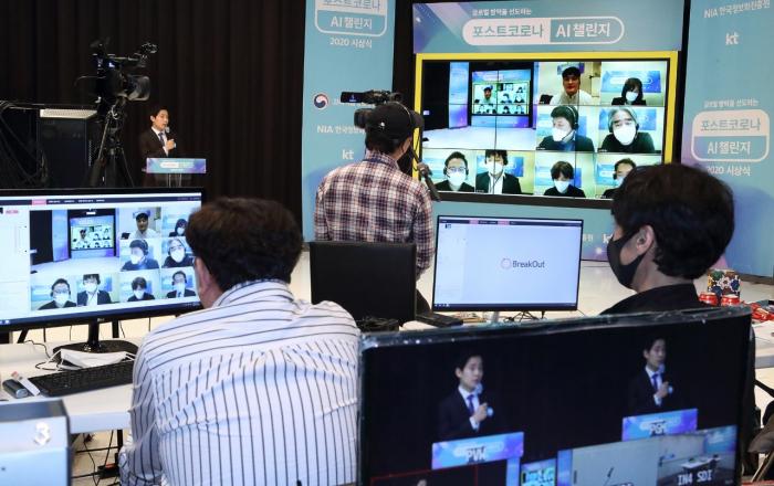 KT가 22일 오후 서울 양천구 KT 크리에이터 팩토리 센터에서 ‘포스트코로나 AI 챌린지’ 공모전의 시상식을 개최했다고 밝혔다. 포스트코로나 AI 챌린지는 총상금 1억 원 규모로 대한민국 국민의 안전에 기여하기 위해 KT가 과학기술정보통신부, 한국정보화진흥원(NIA