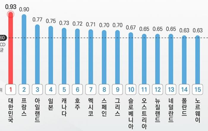 한국이 경제협력개발기구(OECD)가 실시하는 ‘2019 공공데이터 평가’에서 2015년과 2017년에 이어 3회 연속 1위를 기록했다.OECD가 14일 발표한 ‘2019년 OECD 정부백서(Government at a Glance 2019)’에 따르면 한국은 공공데이터
