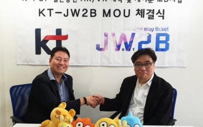 KT는 지난 20일 일본 도쿄에서 현지 공연기획사 JW2B(제이더블유투비, 대표 고광원)와 'K-POP 일본공연 AR·VR 제작 및 케이툰 MD 사업 협력을 위한 업무협약'을 체결했다고 21일 밝혔다. JW2B는 다수의 한국 아이돌과 배우들의 일본공연 활동을 주최해 온