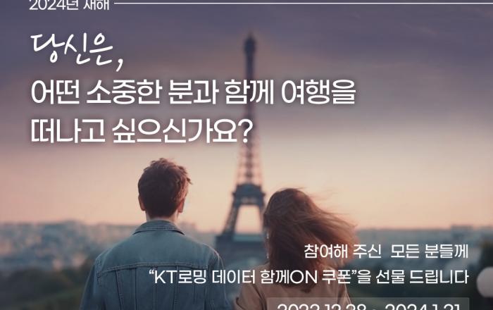 KT가 해외여행 수요가 증가하는 연말연시를 맞아 고객 혜택을 위한 로밍 프로모션을 실시한다고 28일 밝혔다. KT는 올해 해외 여행객 120만 명이 선택한 인기 로밍 ‘데이터 함께 ON’에 대한 프로모션을 준비했다. 이벤트를 통해 가족/친구/애인 등
