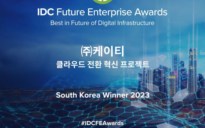 KT는 ‘클라우드 전환 혁신 프로젝트’ 성과를 인정받아 글로벌 IT 시장분석 기관 IDC의 ‘2023년 IDC 퓨처 엔터프라이즈 어워드 (Future Enterprise Award)’에서 ‘미래의 디지털 인프라스트럭처 (Best in Future of Digital I