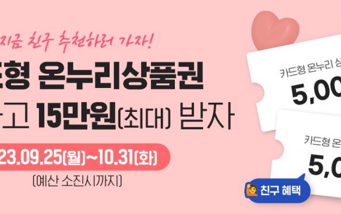 KT는 온누리상품권 발행처인 소상공인시장진흥공단과 함께 추석을 앞둔 이달 25일부터 다음달 31일까지 카드형 온누리상품권 이용자를 대상으로 최대 15만원까지 지급하는 ‘지인 추천’ 이벤트를 시행한다고 25일 밝혔다. KT가 운영하는 충전식 카드형 온