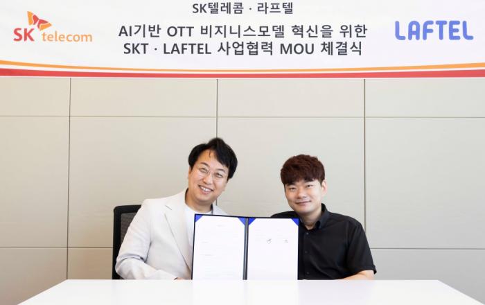 SK텔레콤이 애니메이션 전문 OTT 라프텔(대표이사 박종원, www.laftel.net )과 AI 기반 콘텐츠 제공 및 마케팅 협력을 위한 업무협약(MOU)을 체결했다고 4일 밝혔다.라프텔(LAFTEL) 본사에서 3일 오후 진행된 MOU 체결식에는