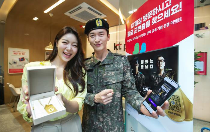 KT가 지니 TV 오리지널 <신병2> VOD 단독 공개 기념으로 KT 전국 오프라인 매장에서 ‘황금 군번줄을 찾아라’ 이벤트를 진행한다고 1일 밝혔다. KT는 전국 KT 대리점, 대형마트, 플라자 등 오프라인 매장에 부착된 ‘신병 2’ 홍