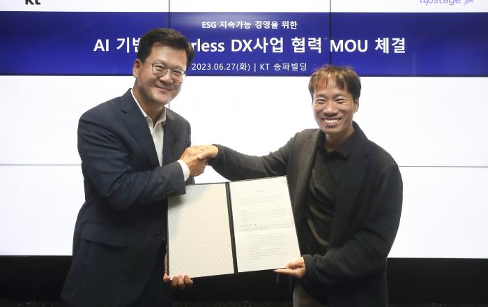 KT(www.kt.com)가 업스테이지와 B2B(기업간 거래) 영역에서 인공지능(AI)을 활용한 페이퍼리스(완전 전자화 사무 환경) 분야에서 디지털 전환(DX) 사업을 함께 추진하기 위해 협력한다고 28일 밝혔다. 양사는 27일 서울 송파구 KT 송파빌딩에서