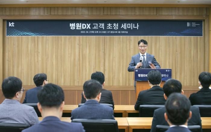 KT가 경기 성남시 KT 분당본사타워에서 '병원 디지털 전환 세미나'를 개최했다고 27일 밝혔다. KT 강남서부광역본부 주최로 이날 개최한 세미나에는 서울, 경기 등 수도권 지역 중대형 병원 원장 및 담당자 100여 명이 참석했다. 세미나는 KT 강남법인고객본부