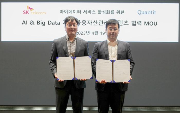 SK텔레콤이 AI 핀테크기업 퀀팃과 AI와 빅데이터에 기반한 금융자산관리 콘텐츠 서비스 분야에서 상호 협력하기로 MOU를 체결했다고 20일 밝혔다. 이번 협약에 따라 퀀팃은 SKT 본인확인서비스 PASS 앱의 ‘마이데이터’에 ‘글로벌경제 키워드’와 글로벌 금