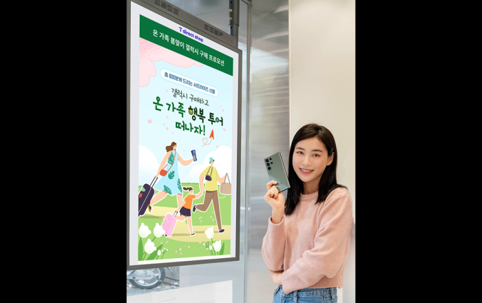SK텔레콤 홍보모델이 T다이렉트샵에서 진행하는 봄맞이 스마트폰 구매 프로모션을 소개하고 있다. 14일부터 28일까지 T다이렉트샵에서 갤럭시S23, 갤럭시S22, 갤럭시 Z 시리즈, 갤럭시 퀀텀3 등을 구매 및 개통한 후 이벤트 페이지에 응모하면 200만원 상당 여행상품
