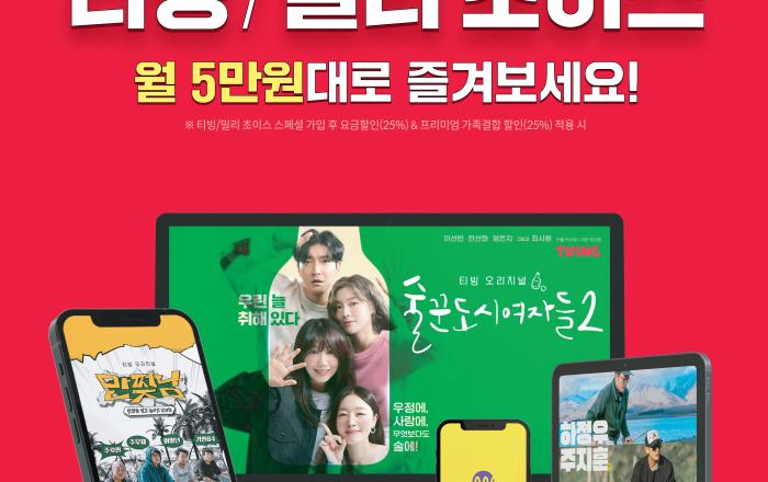 KT(www.kt.com)는 5G 초이스에 ‘티빙’과 ‘밀리의 서재’ 혜택을기본으로 제공하는 ‘티빙/밀리 초이스’를 선보인다고 1일 밝혔다. 티빙/밀리 초이스는 기존 티빙/지니 초이스와 동일하게 프리미엄(13만원), 스페셜(11만원), 베이직