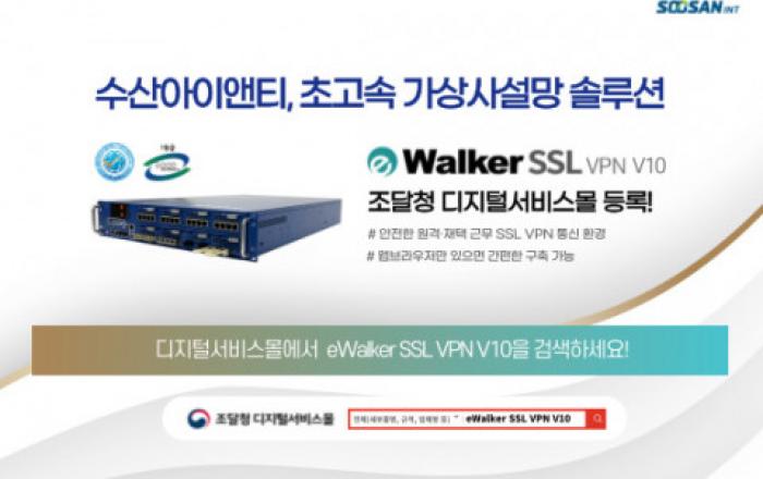 네트워크 보안솔루션 전문기업 수산아이앤티가 가상사설망 보안솔루션 ‘eWalker SSL VPN V10’을 총판사인 티앤디소프트를 통해 조달청 디지털서비스몰에 공식 등록했다고 20일 밝혔다.조달청 디지털서비스몰은 조달청에서 운영 중인 공공조달 전용 플랫폼으로 기술력과 품