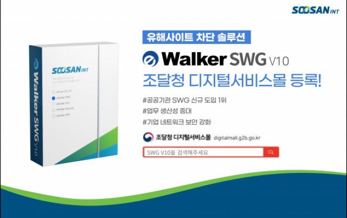 수산아이앤티는 유해사이트 차단 솔루션 ‘eWalker SWG V10’을 총판사인 티앤디소프트를 통해 조달청 디지털서비스몰에 등록 완료했다고 22일 밝혔다.국내 공공기관 SWG 신규 도입 1위인 수산아이앤티의 유해사이트 차단 솔루션 ‘eWalker SWG V9’가 이번에