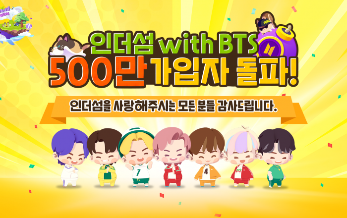 방탄소년단이 참여한 신규 모바일 게임 ‘인더섬 with BTS’가 지난 10일 출시 12일만에 글로벌 누적 가입자 수 500만을 돌파했다.방탄소년단이 기획 및 개발에 참여하여 출시 전부터 많은 관심을 받아온 ‘인더섬 with BTS’는 지난 6월 28일 정식 서비스 출