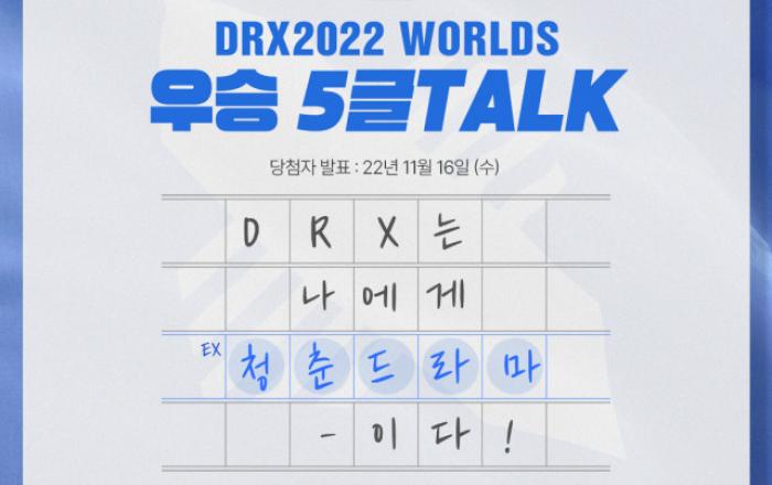대한민국 대표 서점 예스24가 리그 오브 레전드(LoL) 이스포츠팀 DRX의 ‘2022 리그 오브 레전드(LoL) 월드 챔피언십’ 우승을 기념해 ‘DRX 2022 Worlds 우승 5글 Talk!’ 이벤트를 11일까지 진행한다.예스24는 DRX의 2022 리그 오브 레