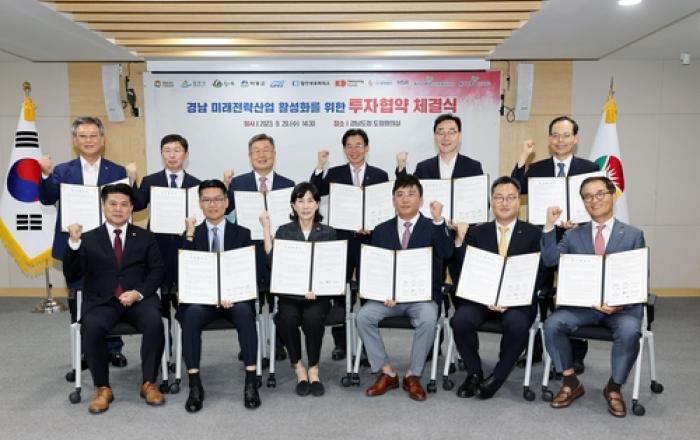 경남도와 하동군, 광양만권경제자유구역청은 지난 20일 ㈜엘앤에프와 경남도 도정회의실에서 하승철 하동군수, 김병규 경제부지사, 송상락 광양만권경제자유구역청장, 최수안 ㈜엘앤에프 대표이사가 참석한 가운데 광양만권경제자유구역 하동지구 대송산업단지에 이차전지 소재 양산 공장