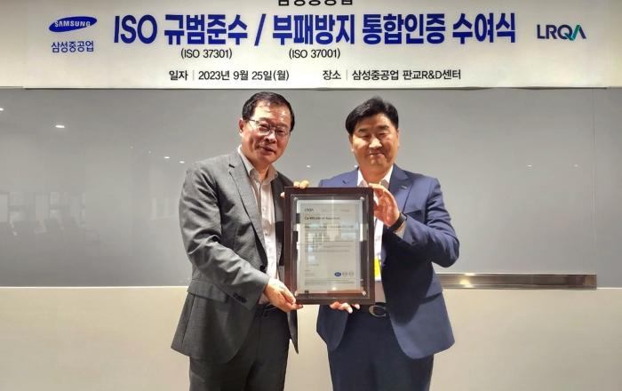삼성중공업이 로이드인증원(LRQA)으로부터 조선업계 최초로 국제표준화기구의 '규범준수 경영시스템(ISO 37301)'과 '부패방지경영시스템(ISO 37001)' 인증을 통합 취득했다. 삼성중공업은 판교 R&D센터에서 정진택 대표이