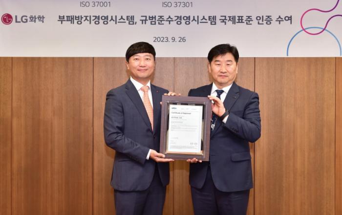 LG화학이 글로벌 스탠더드에 기반한 준법경영 체제 강화에 나섰다. LG화학은 영국 로이드 인증원으로부터 컴플라이언스 경영시스템(ISO 37301)과 부패방지 경영시스템(ISO 37001)의 국제표준인증을 동시에 받았다고 26일 밝혔다. 컴플