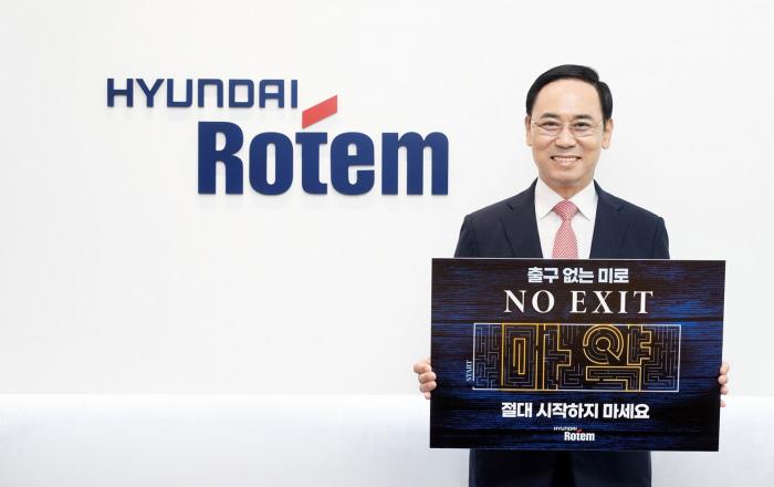 현대로템은 18일 이용배 현대로템 대표이사 사장이 임직원들과 함께 마약 예방을 위한 ‘NO EXIT(노 엑시트)’ 캠페인에 참여했다고 밝혔다. ‘NO EXIT(노 엑시트)’ 릴레이 캠페인은 경찰청이 마약퇴치운동본부와 관계부처 합동으로 지난
