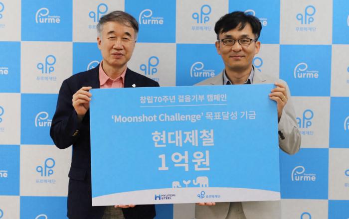 현대제철이 창립 70주년을 맞아 '70cm의 기적, 문샷 챌린지(Moonshot Challenge)' 걸음기부 캠페인을 성공적으로 마치고 푸르메재단에 목표달성 기금 1억원을 기부했다고 7일 밝혔다. 이번 임직원 걸음기부 캠페인은 사람의 평균 보폭인 70cm가 모여