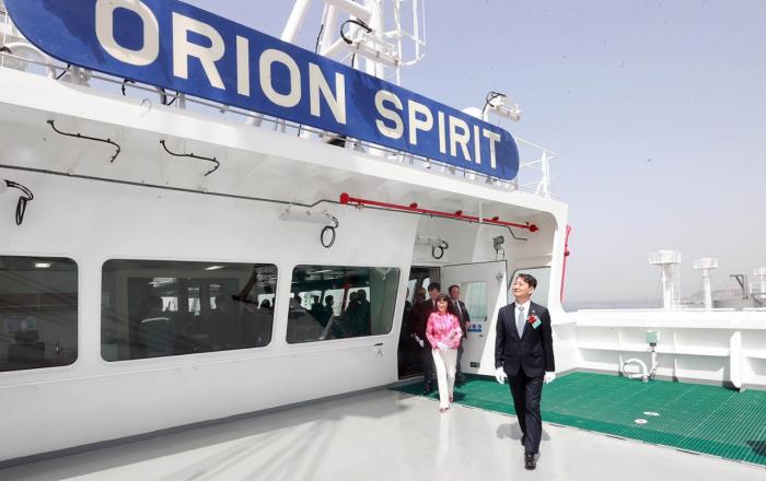 산업통상자원부는 안덕근 장관이 지난 18일 삼성중공업 거제조선소에서 대형 액화천연가스(LNG) 운반선 수출 500호 선인 ‘오리온 스피릿’ (Orion Spirit)호의 명명식에 참석했다고 19일 밝혔다. 이번 500번째 액화천연가스 운반선 수출로 K-조선의 기술력과