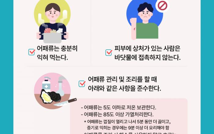 질병관리청은 올해 첫 비브리오패혈증 환자가 발생, 사망함에 비브리오패혈증 예방을 위해 각별한 주의를 당부했다. 비브리오패혈증은 비브리오 패혈균 감염에 의한 급성 패혈증으로, 해수 온도가 18℃ 이상일 때 증식하는 것으로 알려져 있다. 주요 감염경로는 균에 오염된 해산물