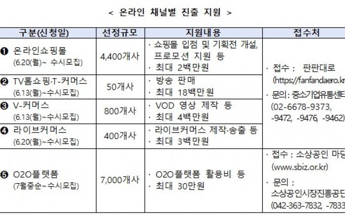 중소벤처기업부는 오는 13일부터 ‘2022년도 소상공인 온라인 판로 지원사업 통합공고(추경)’를 통해 5개 채널별 참여 희망 소상공인 접수를 받는다고 9일 밝혔다.중기부는 이번 추가 모집에서 올해 제2회 추가경정예산 223억 5000만 원을 활용해 소상공인 1만 300