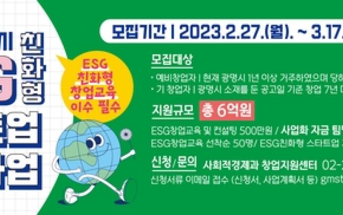 광명시는 혁신적인 기술이나 비즈니스 모델을 통해 사회문제를 해결하고 지속 가능한 성장을 위해 노력하는 ESG 친화형 스타트업을 육성하기 위해 3월 13일까지 창업기업을 모집한다. 광명시 은 약 20개의 창업기업에 총 6억 원의 창업자금을 지원한다. 대상자로 선정되