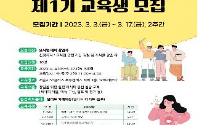 도봉구는 지역상권 변화를 이끌 경쟁력 있는 창업인재를 육성하기 위해 '상권혁신교육' 제1기 교육생을 모집한다. '도봉구 상권혁신교육'은 요식업 예비 창업자를 대상으로 실전 레시피 중심의 요식업 전문 창업 교육을 실시해 경쟁력 있는 창업인재를 양성하는 민선8기 공약사