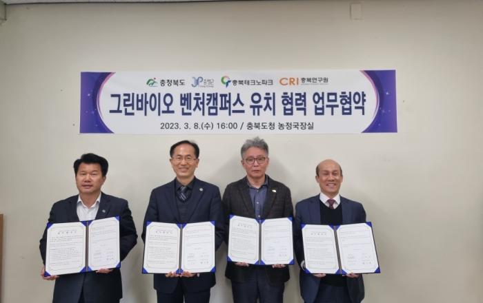 충청북도는 ‘그린바이오 벤처 캠퍼스’ 유치를 위해 증평군, 충북연구원, 충북테크노파크와 8일(수) 오후 4시 충북도청에서 업무협약을 체결했다고 밝혔다. 농림축산식품부가 주관하는‘그린바이오 벤처 캠퍼스’사업은 마이크로바이옴, 대체식품?메디푸드, 종자 등 5대 유망산업